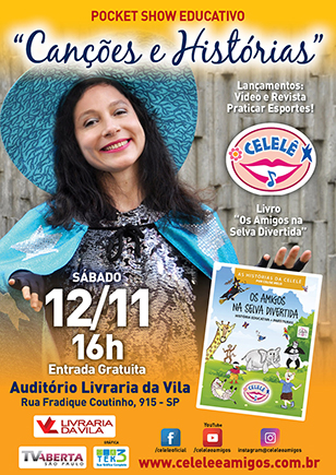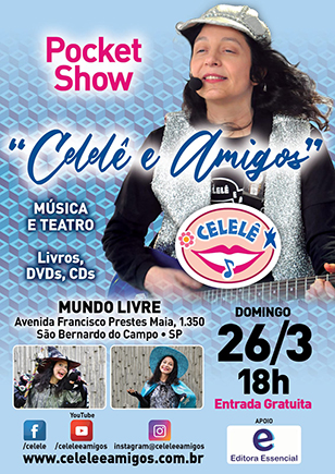The artist and author Celise Melo, known as Celelê, invites you to the "Pocket Show Celelê and Friends" with Live Music and Theater! For all ages! On Sunday, October, 16 at 5:30 pm at Casa de Cultura Odisseia, in São Paulo. Alameda Ministro Rocha Azevedo 463, Consolação subway. Free entrance!